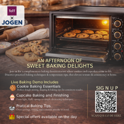 Customers who hold the complimentary hands-on/demo class vouchers are to email cookbakehost@tottstore.com to register for cooking classes. If you hold a complimentary cooking class voucher but made payment for a cooking class, the payment made is strictly non-refundable. Please note that some of our cooking classes cannot be redeemed with complimentary class vouchers and/or redemption letter. There is also a quota for the number of complimentary class vouchers redeemed per class. Do register for classes in advance to avoid disappointment as classes redeemed using complimentary vouchers are on a first-come-first-serve basis.